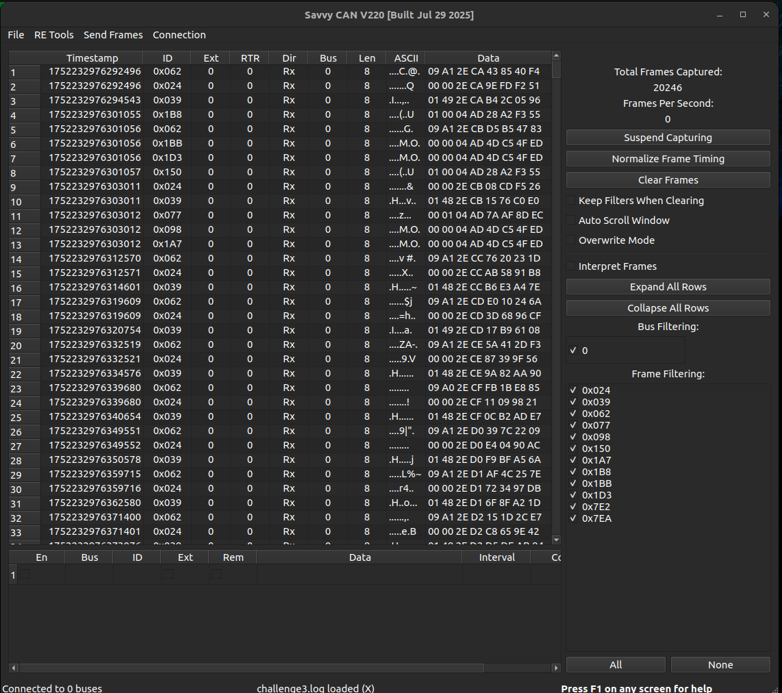 The CAN traffic log file challenge3.log is a text file that can simply be opened and analysed in any text editor. Also wireshark can open CAN traffic logs. To solve this challenge, I decided to use another great tool - Savvy CAN. It’s a GUI tool that can assist with CAN traffic analysis a lot. Once we open the traffic log in Savvy CAN, we will see the traffic list and some statistics: