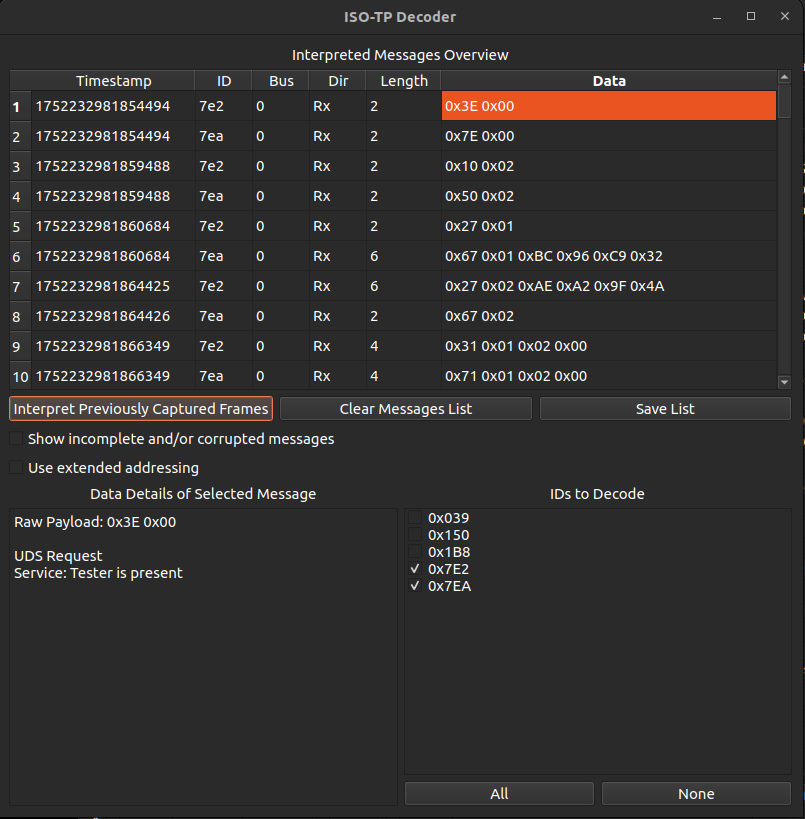 We can observe popped up ISO-TP message list and easily filter out irrelevant CAN IDs 0x039, 0x150, and 0x1B8, as their Data sections do not contain actual UDS data. This will leave us with 2 CAN IDs: 0x7E2 and 0x7EA. Don’t forget to press Interpret Previously Captured Frames after you uncheck irrelevant CAN IDs: